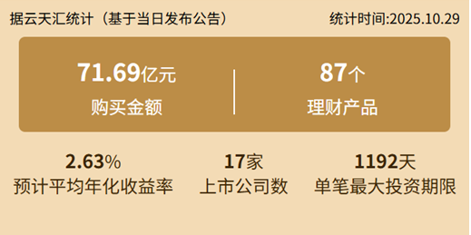 2025年10月29日,上市公司购买理财金额71.69亿元,共17家上市公司,理财产品87个。