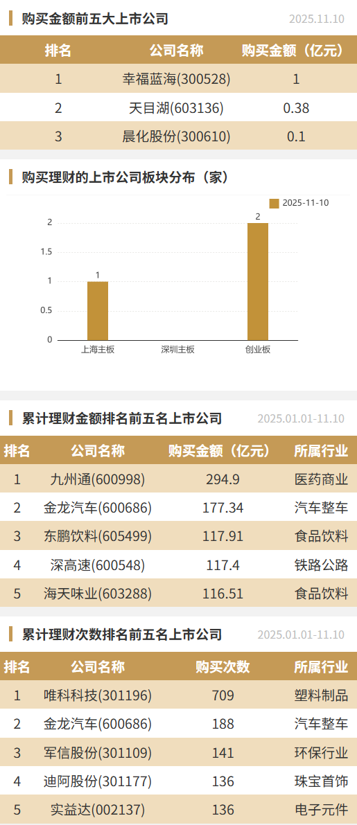 2025年11月10日,上市公司购买理财金额1.48亿元,共3家上市公司,理财产品4个。