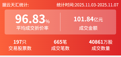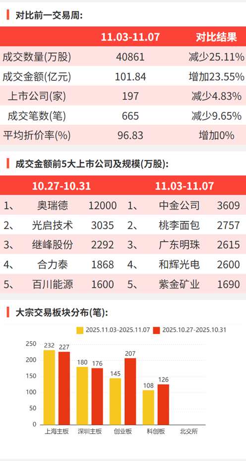 2025年11月3日至2025年11月7日,大宗交易成交金额101.84亿元,交易股票数197只,成交笔数665笔,平均成交折价率为96.83%,成交数量4.09亿股。