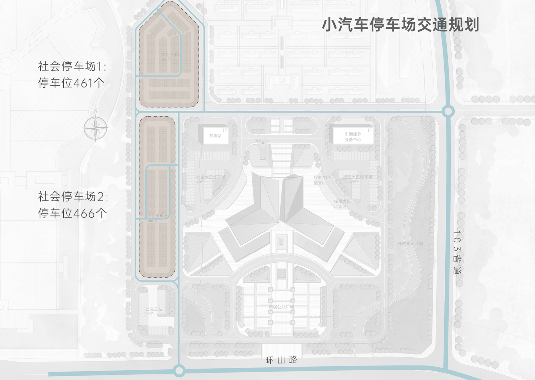 巴士服务站设计于基地东侧,便于物流移动及旅客日常的交通需求,另在场馆周围设置充足的停车车位,让游客能通过环形山路往返于集散中心。