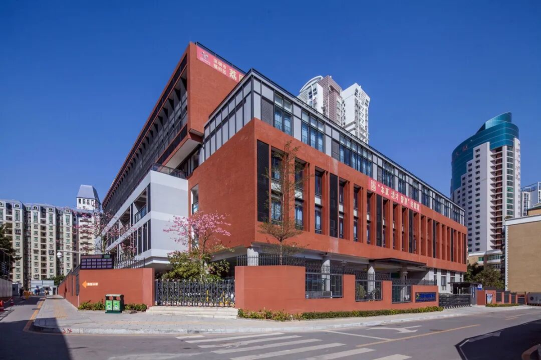 荔园外国语小学北校区位于深圳福田区中部莲花街道,莲花路与景田路交汇处西南侧,四周被既有旧建筑包围。校园用地极为有限,正位于旧改区中央,构成整个周边社区的中轴。