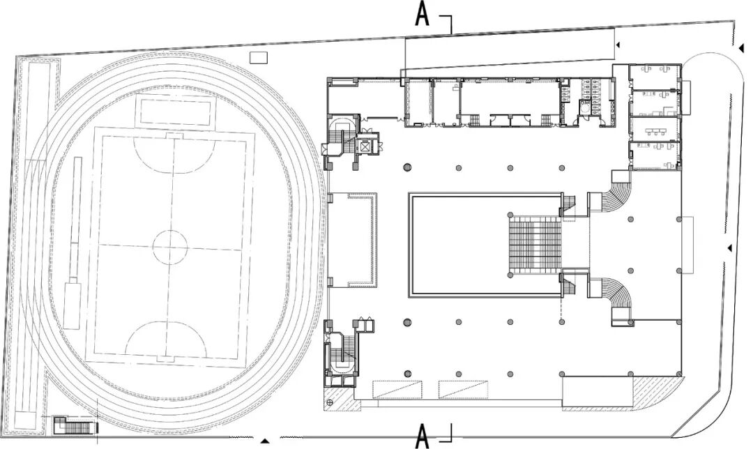 方案首先从城市角度重新整理联通了周边道路系统,通过调整路段坡度,将天骄二路与南侧道路系统连通,改善了原本基地孤岛化问题。巧妙利用基地自然高差,将学校教学楼设置在较高的南侧,面向南侧和东侧的小区打开。打通后的天骄二路周边社区道路系统相连,延伸到地块北侧的健身会所,从而把地下一层与周边社区联动形成一个体育共享活动空间——一座风雨操场。