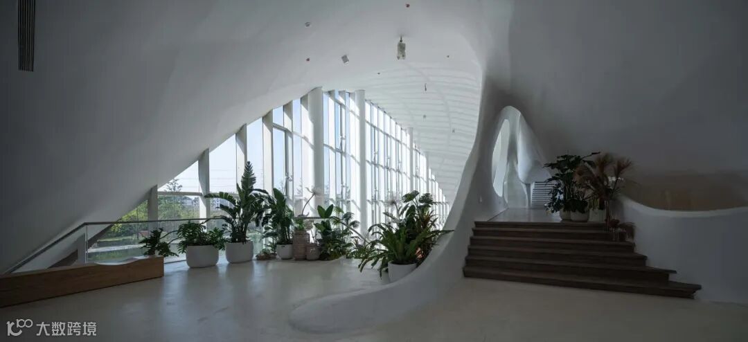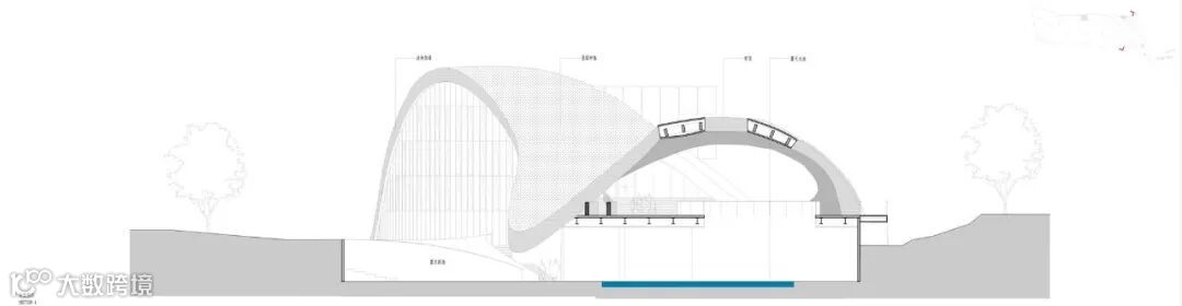 建筑的功能空间和灰空间两片壳面交汇形成一个巨大的大平台公共空间和垂直于穹壳的通高空间。正反两道壳面对外部环境进行了取景的剪裁,使得这个空间成为了这个建筑最富有自然环境在建筑中重塑意义精神的场所。