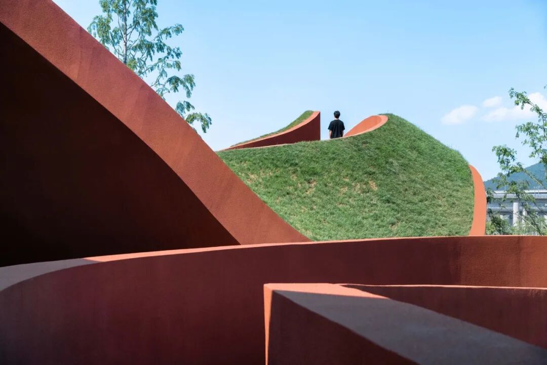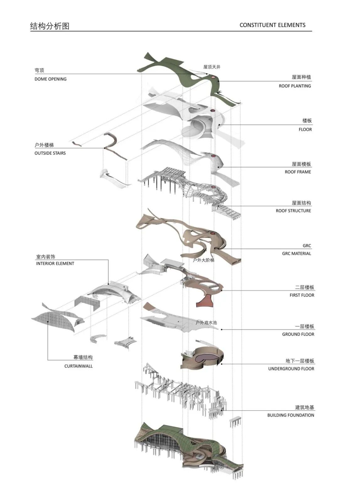 Form Deduced from Natural ElementsThe overall plan and elevations of the building are projected by the external shape of the mountain and the land contour. When comes to this individual building block, the architects began to carry out fascinating and creative imagination about a geological movement caused by a worm wiggling in the ground. As worms crawl through, a path is formed as the boundary of the inside and outside of the building. The wormhole shaped by drilling is the node where to insert a viewing platform. The curve morphological shape of the building is a figurative representation of the existing mountain. The steel structure with rigid deflection of the whole building implicitly reveals the beauty of the power in earth. The project seems to be squeezed out of the ground by natural forces underneath the crust, which is an abstract expression of the three-dimensional profile of the geological space. With a whole coverage of green plants over the roof, the building is like a natural mountain exists on the site. The architects slightly uncover the ground to spontaneously reveal the space.