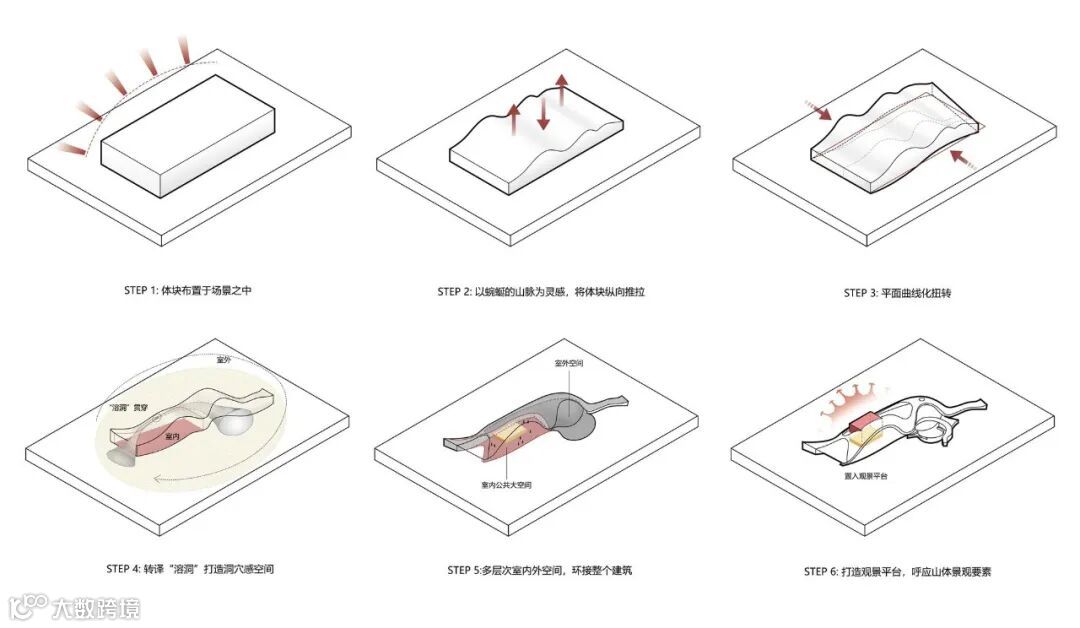建筑的‘模形’起始于山体和大地等高线的‘投影’;通过一条虫子蠕动的运动过程将地质运动改变大地地貌的力量对‘模形’进行了‘壳体’运动的演绎,虫的路径亦成为了建筑室内外‘壳面’的边界;在‘虫洞’的位置,嵌入了贯穿自然要素的观景方盒子。柔和的形态是展露其外的对外部山体的成像,刚性挠度的曲率线条则是内在蕴藏的源于令人敬畏的地表之下大地力量的含蓄侧露。整个建筑就像从地壳之下被自然造山力量挤压出地面似的,是地质空间的三维剖面。种植在壳体表面的绿植屋面,使得这个建筑仿佛不是被建筑师空降在这个场所里,而更像是原本存在,只是没有把附着在外的地表揭开被见而已。