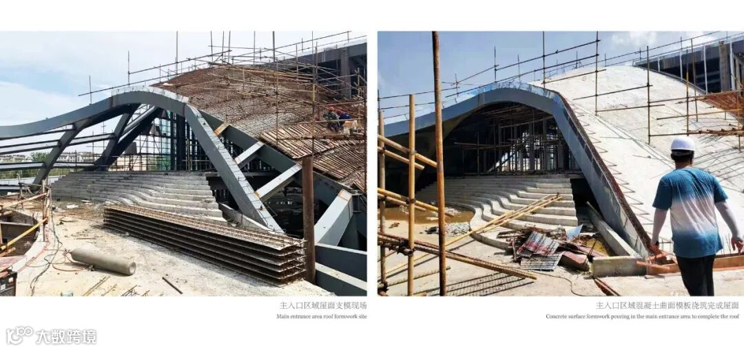 跨越市政道路的屋面,同时也是一个联系南北地块的步行桥面。从桥上走过,欣赏着建筑和远山的叠影重重,不经意间,也走向了那个穹壳空间。