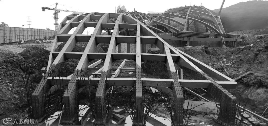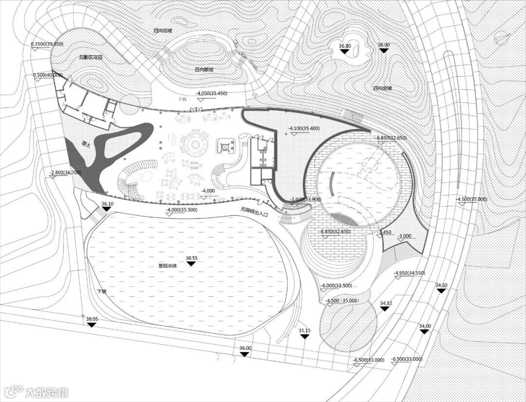 比喻山体切面的片墙构成了通往建筑下沉空间的边界,在边界之间,是一个下沉的露天剧场。这个剧场将会承担未来建筑的室外表演场地。