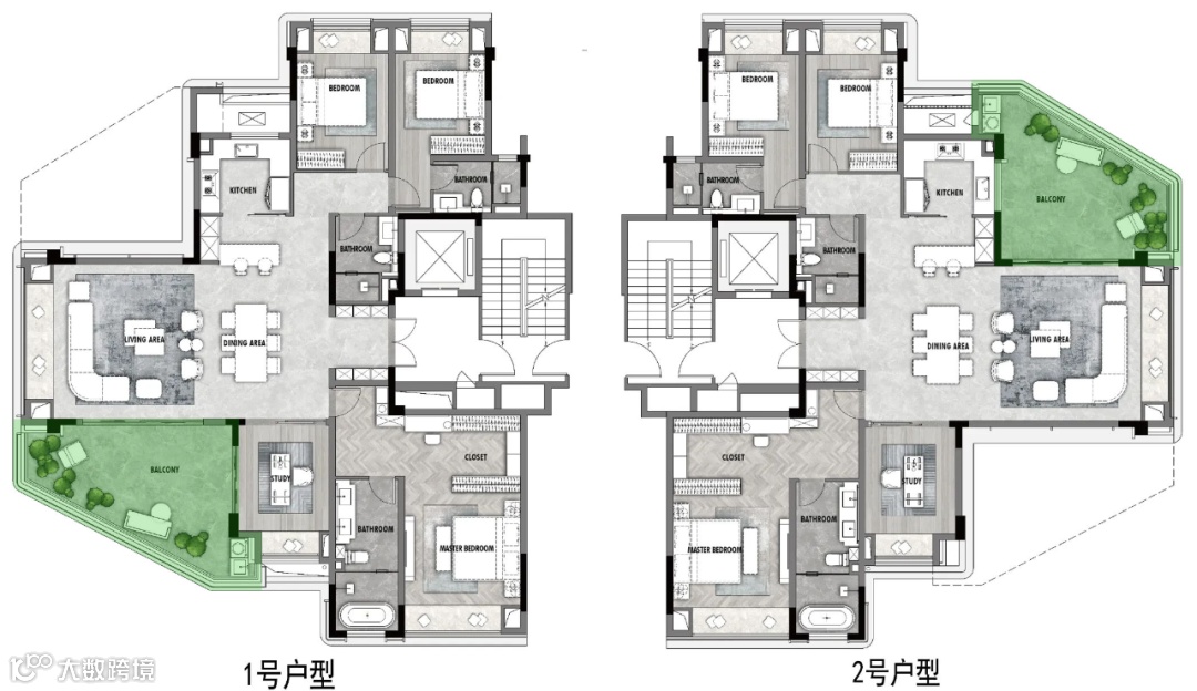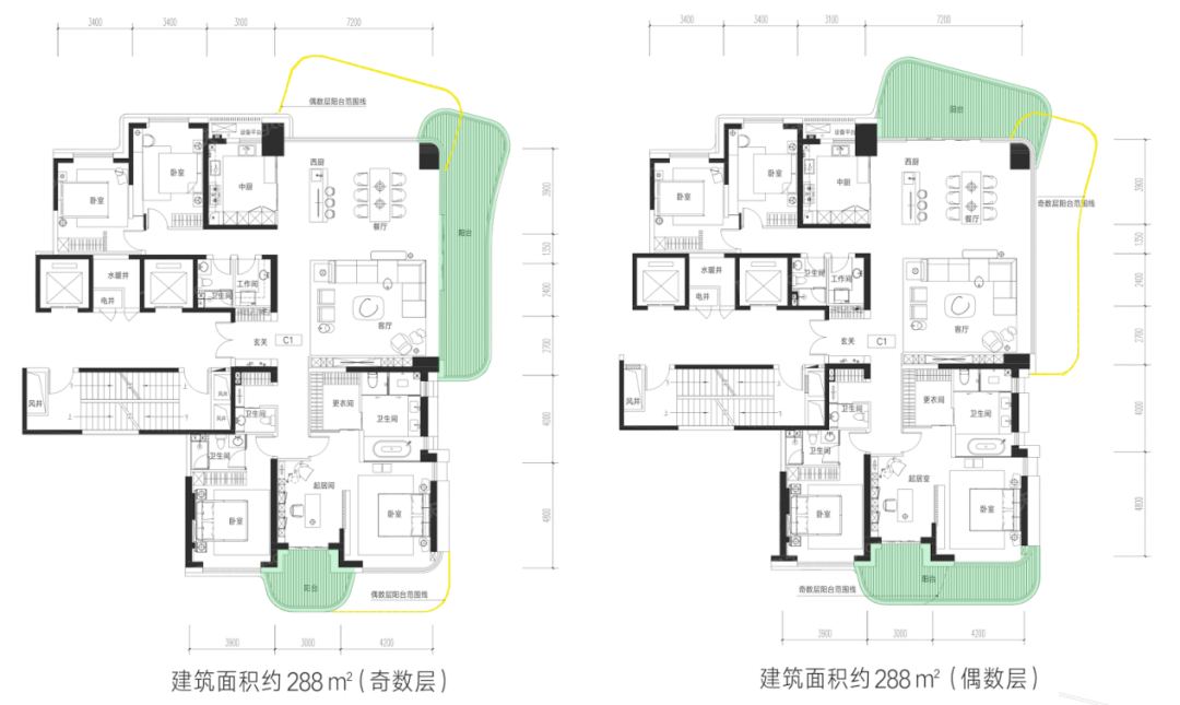 同样是建面约288㎡的奇数层和偶数层户型,其最大的区别在于阳台的位置。