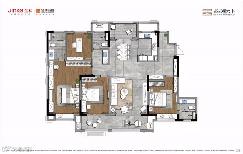 金科金地商置观天下建面约190㎡四房两厅三卫户型,约7.6m南向双开间阳台,观景、健身、休憩......