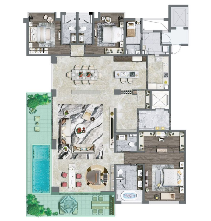 昆明西派国樾建筑面积约360㎡户型,23米转角阳台,极限采光+视野,2.75米进深,摆放价值40万独立泳池。