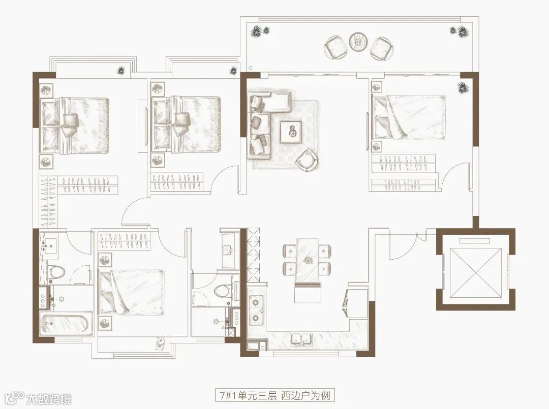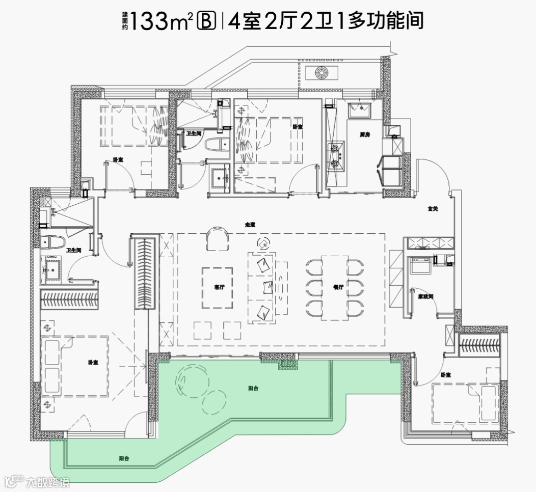 南北双阳台形式基本就一种:客厅+餐厅/厨房位置设阳台,比如下面这个户型:郑州万科·拾谧森语建筑面积约247㎡户型大边厅设计,两个厅南北双阳台环绕,270°环幕视野空间通透。
