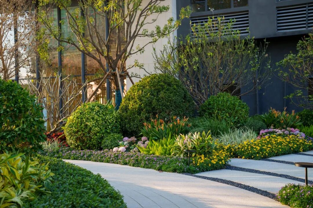 Codiaeum variegatum, alpinia vittata, brachyscome angustifolia, gypsophila paniculata, Iris pseudacorus, sedum lineare. The colorful flower border decorated the site romantically and beautifully, adding warmth and tenderness to the space.