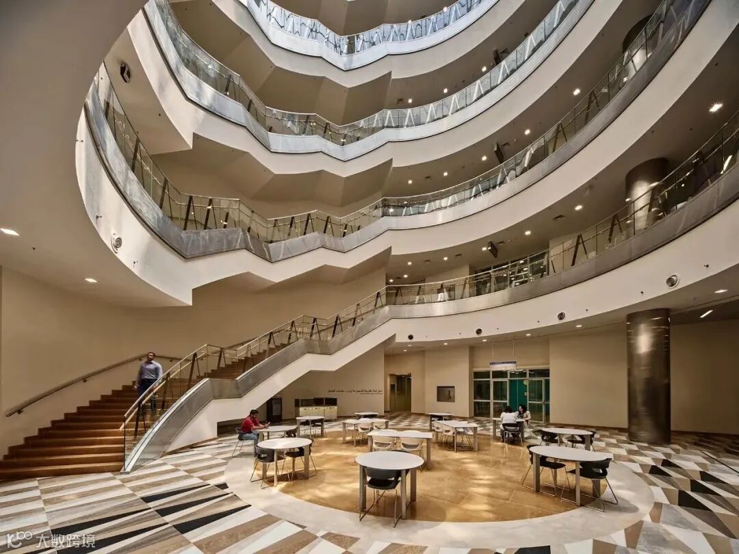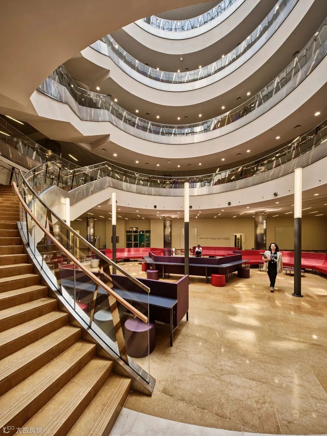 它们提供了所有COLS活动的窗口,并促进了学生于教师的互动。每个中庭的周边都是一个倾斜的螺旋楼梯,提供了通往所有楼层的通道,最终形成一个圆顶天窗形式的眼孔。促进学生合作、非正式学习、社会联系和对内部工作的庆祝是学院是围绕这两个重要领域组织学院的指导原则。