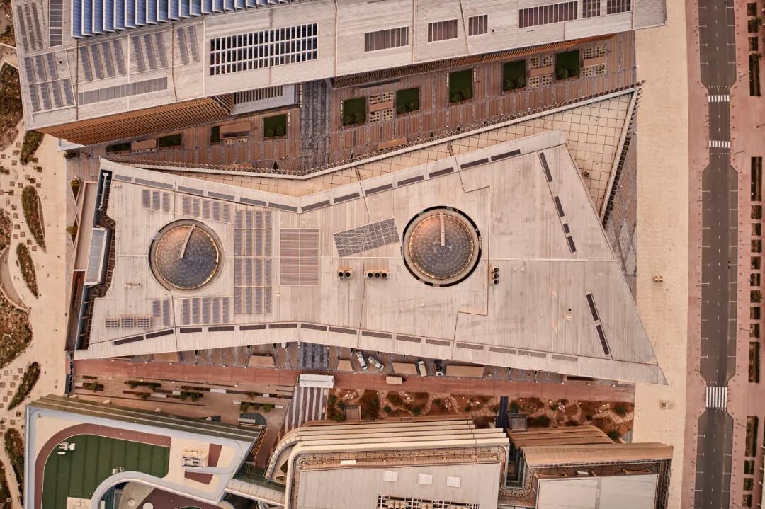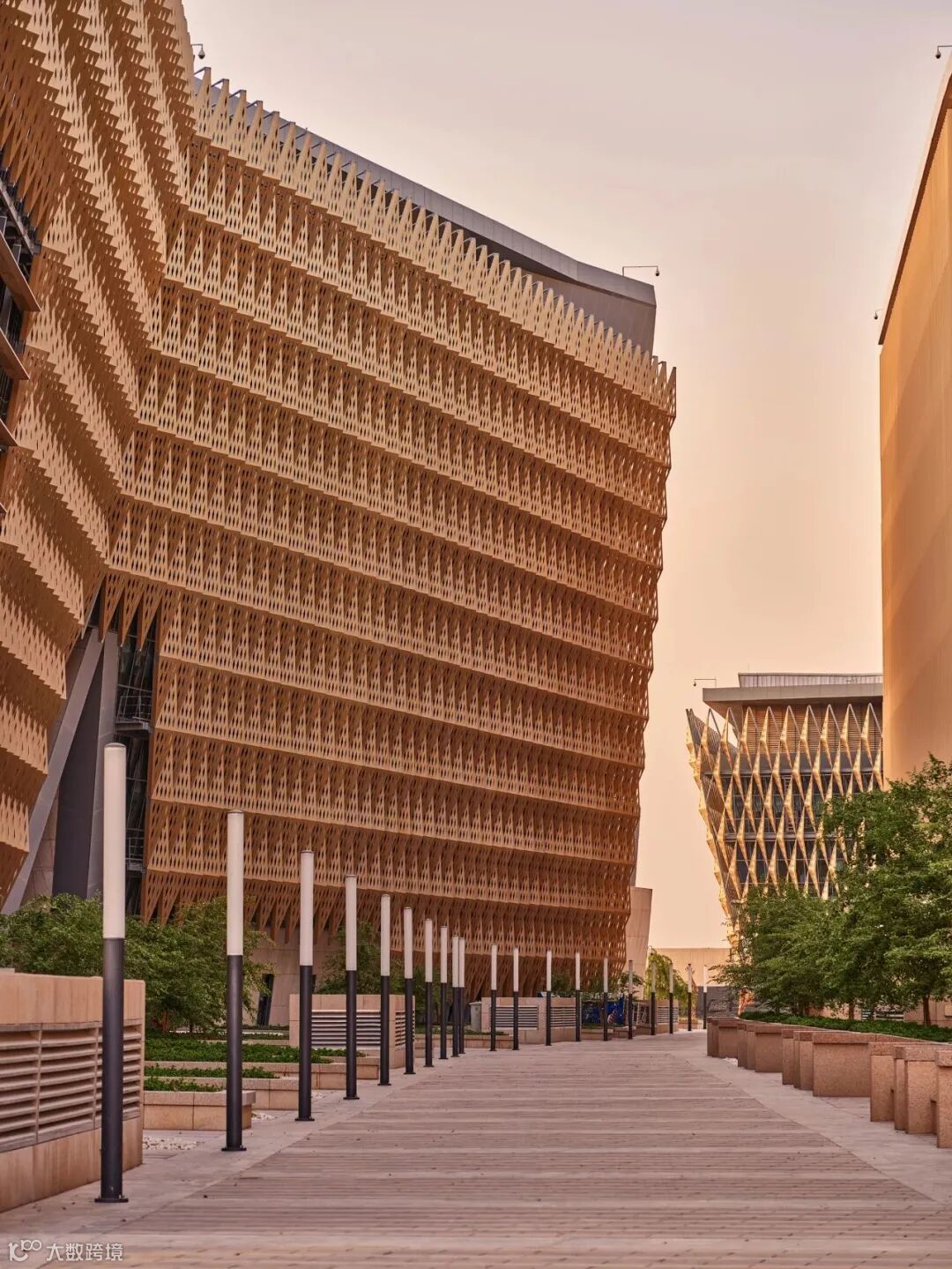 这座符合现场要求的建筑以其引人注目的倾斜立面和引人注目的沙漠色纹理材料而闻名。钻石形状的穿孔金属板阵列可以过滤自然光线,并为室内遮挡刺眼的阳光。金色结构的颜色强度随着太阳在一天中的运动而变化,就像周围的沙漠一样。面板阵列的几何图形在建筑占地面积和周围景观特征中得到呼应。