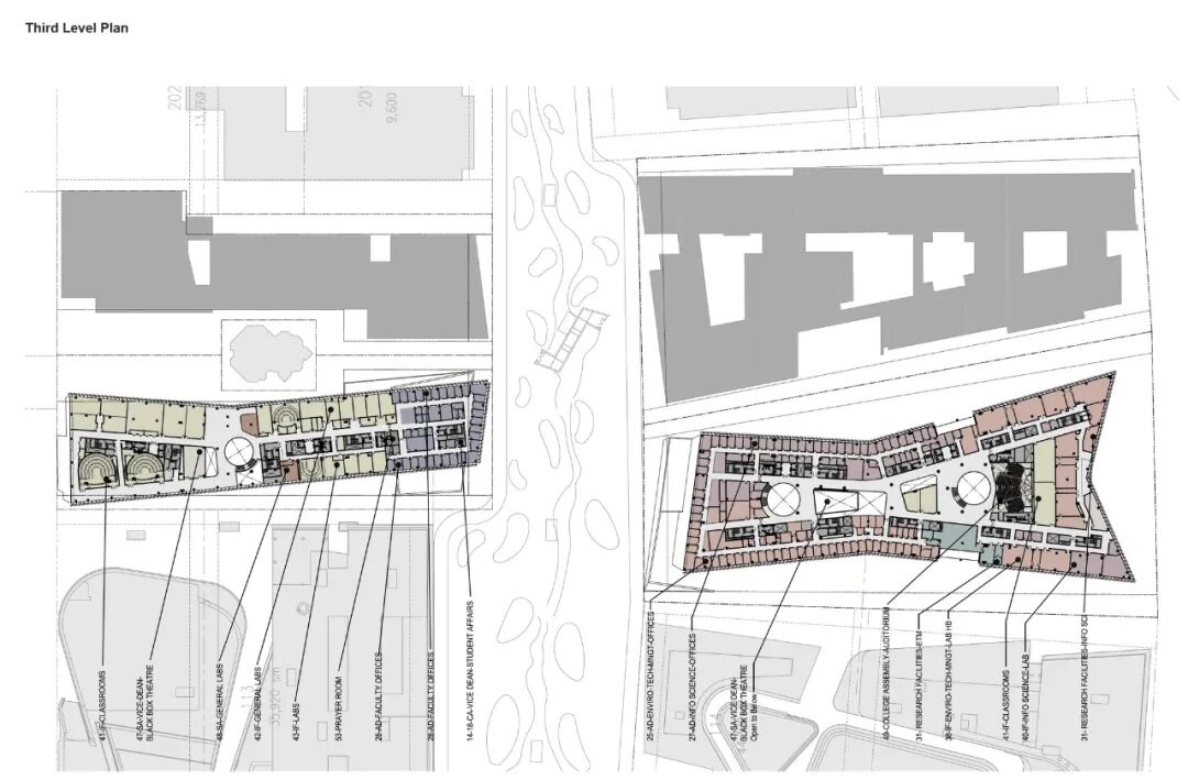 学院内的交通是沿着中庭侧翼的两个南北平行的侧翼组织的。这些流通路径是学院的知识和教学核心,与贯穿校园的东西向走廊交叉,连接着各个学院。这些交叉点形成了COLS内部身份的联系。学生的生活和活动围绕这些节点进行,包括餐饮服务、零售、学生俱乐部、休息室、展览厅和大型演讲设施。