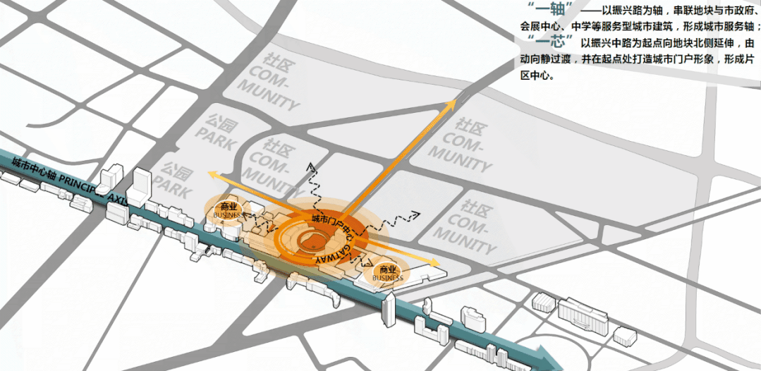 项目前期,经过多轮规划设计,利用优越城市区位,从片区宏观发展的视角考虑,链接既有商业资源,整合水系,公园优势,打造“一轴 • 一芯 • 两环 • 三带”的片区规划框架。