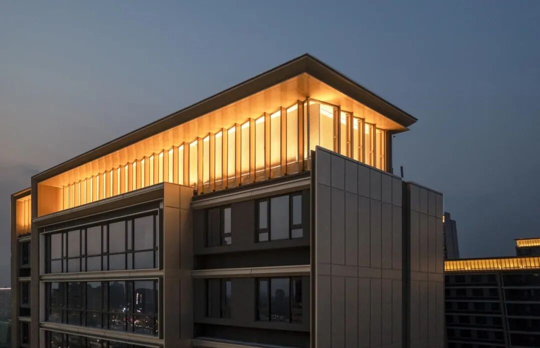 建筑顶部的虚实格栅向天空延伸,塑造出独特的城市天际线形象。细节处理以明确的金属线条装饰,加强了建筑顶部的力度感,局部采用穿孔铝板代替玻璃板,美观而不失品质,打造城市级灯塔,形成一道美丽的风景线。
