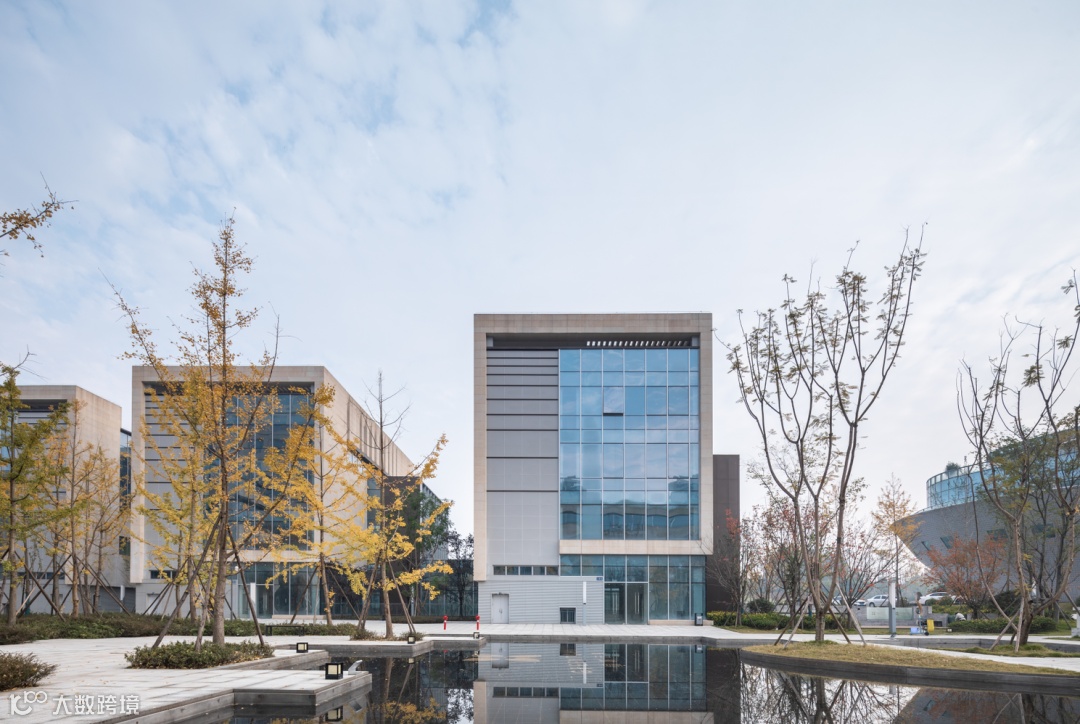 靠近湖边的三栋低层办公建筑,采用简约门式造型,简洁大气、稳重气派。建筑的前端、侧边和屋顶都设计了露台空间,营造了面向兴隆湖的全景视野,科研人工作之余可以在这里放空自我,感悟天地自然。建筑前侧自上而下的格栅,为原本刚硬肃穆的石墙平添了几分柔美。