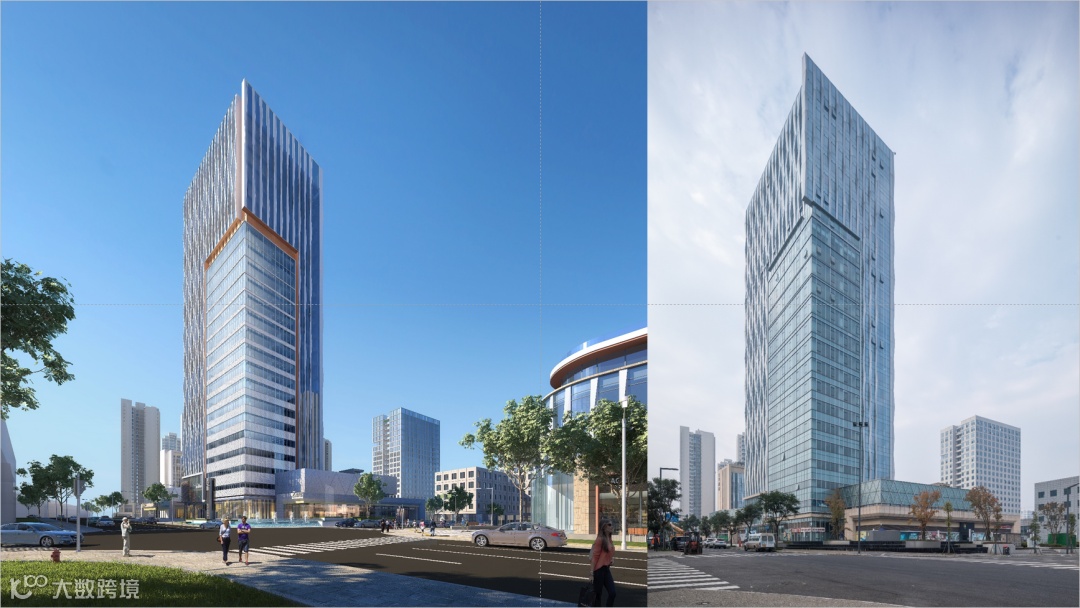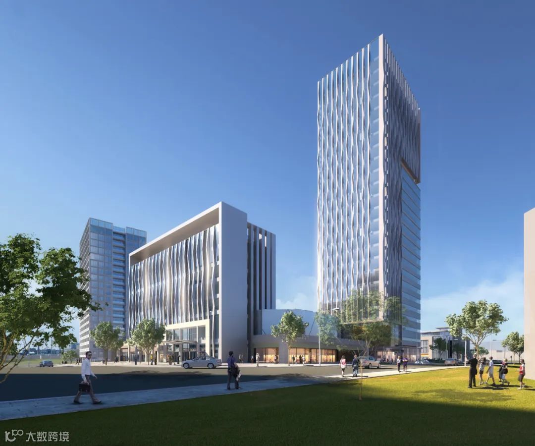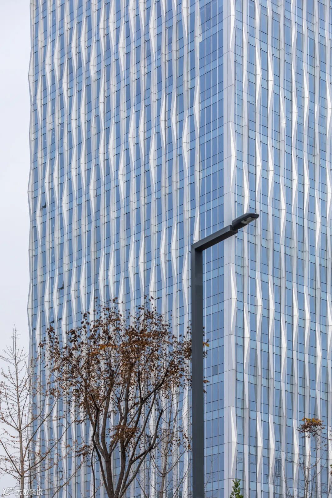 最高层办公楼立面设计抽象水波纹路,将自然中的波浪律动融入建筑,与兴隆湖形成对话。外墙结合玻璃、金属等元素,通过横竖线条的不同处理,强化了建筑的形式感,使建筑更加的挺拔,充满张力。精简的折叠线条和开窗方式的微妙变化,使得建筑立面现代又不失活泼。