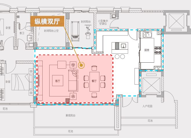 纵横双厅设计,各个功能空间之间联系更紧密,沟通交流无障碍。