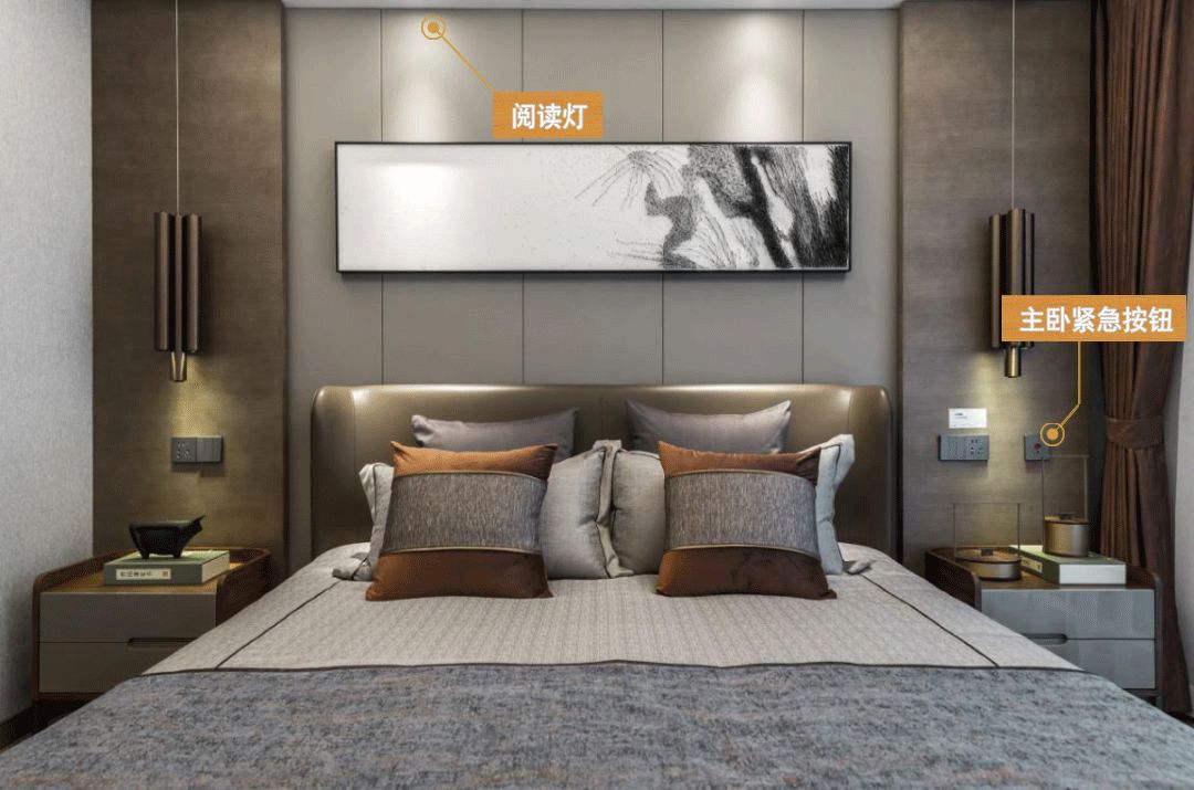 ◎ 恬静的阅读时刻,总有温馨的灯光陪伴。主卧室采用双控开关设计,在临睡前,便于随手关灯。床头设置阅读灯和床尾小夜灯,营造舒适温馨的场景,静静的陪伴你的阅读时光。