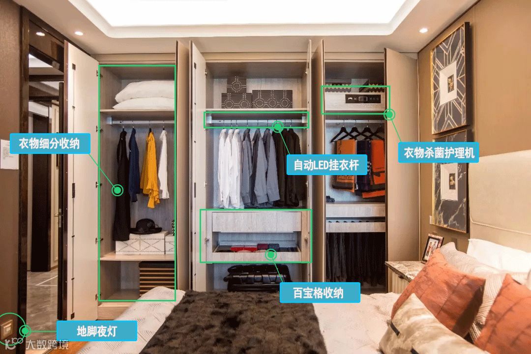 ◎ 衣帽间内设百宝格收纳、衣柜细分收纳等强大的收纳系统可以放置您全部喜爱的衣物,满足男女主人不同季节衣物的归置需求,私密性极强;