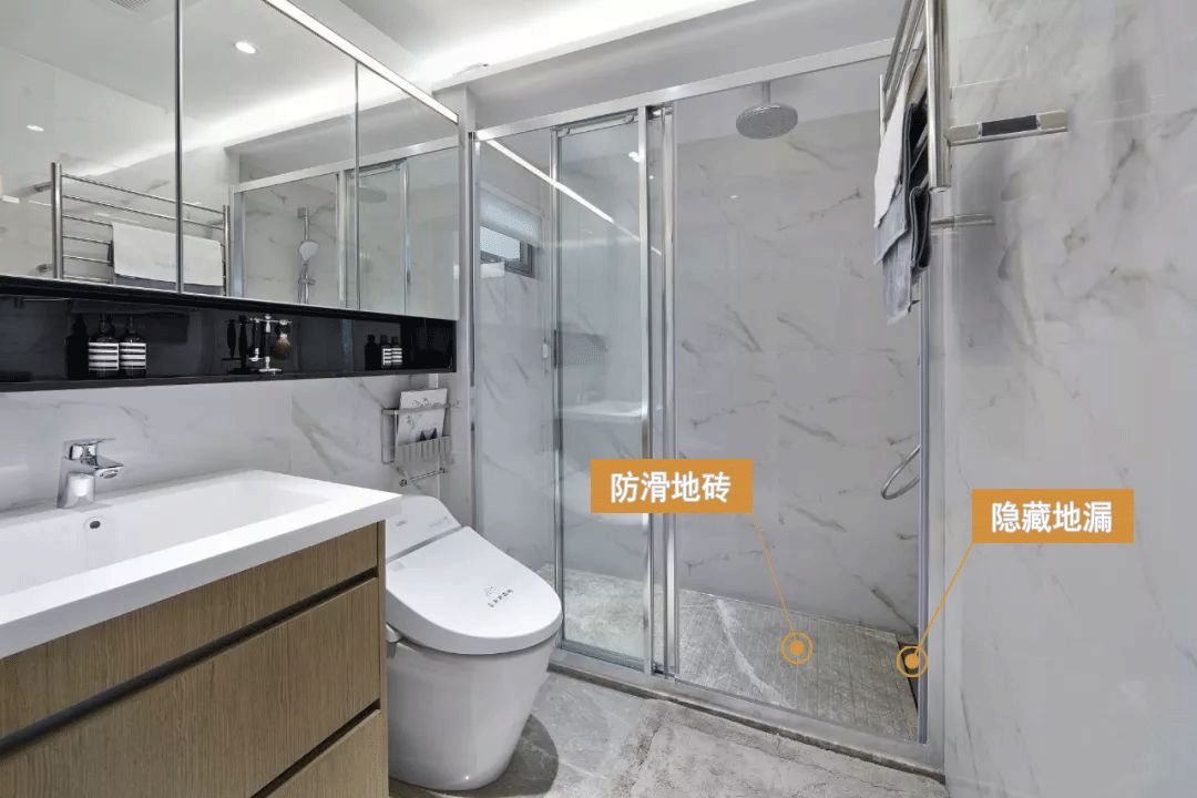 洗手间淋浴区采用了防滑石材设计,防滑且具有吸水性;隐藏式地漏能保证不会露出掉落的毛发,大去水量进一步降低湿滑的危险,极大提高实用舒适感。