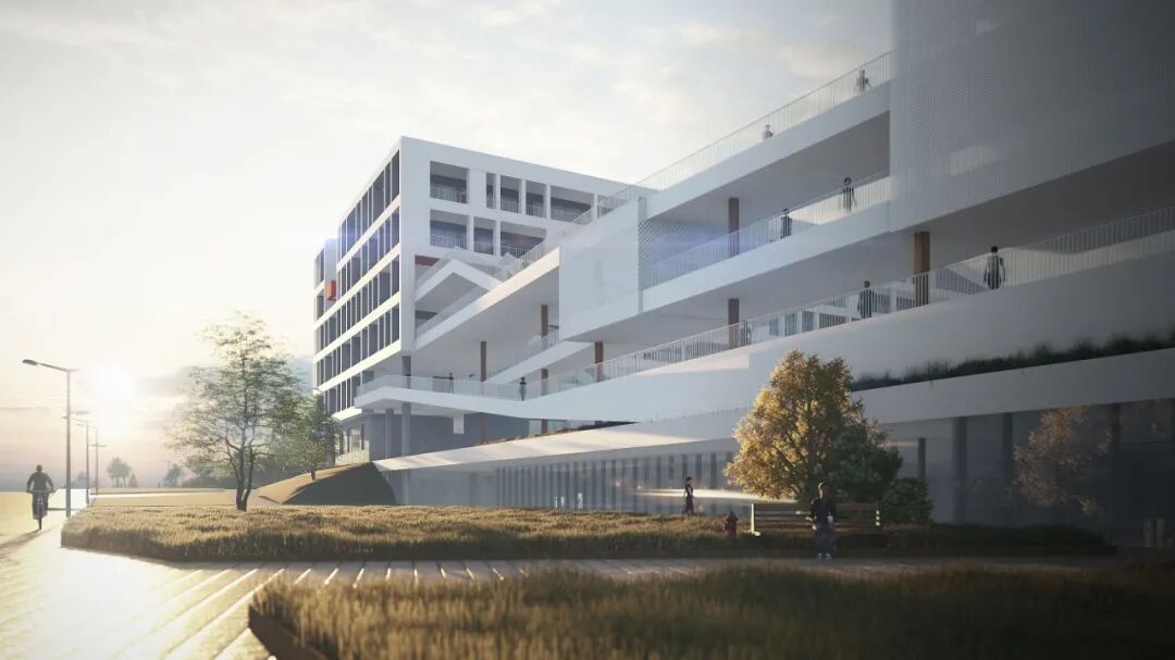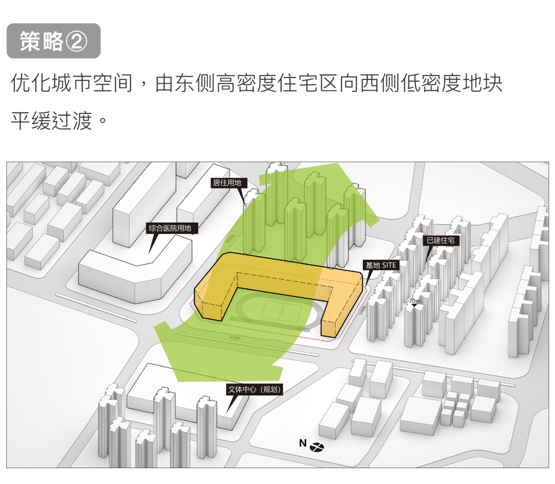 在功能布局上,我们将教学组团放置在西北侧,为城市提供公建界面;生活组团放置在东南侧,靠近周边居住区。同时确定北侧为学校主入口,南侧为学校次入口。校园内建筑体量采用扁平化策略,尽量降低建筑总高度,空间朝水平方向连续延展。