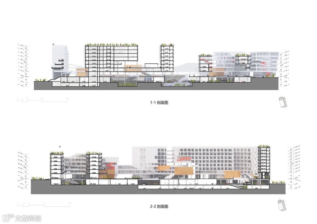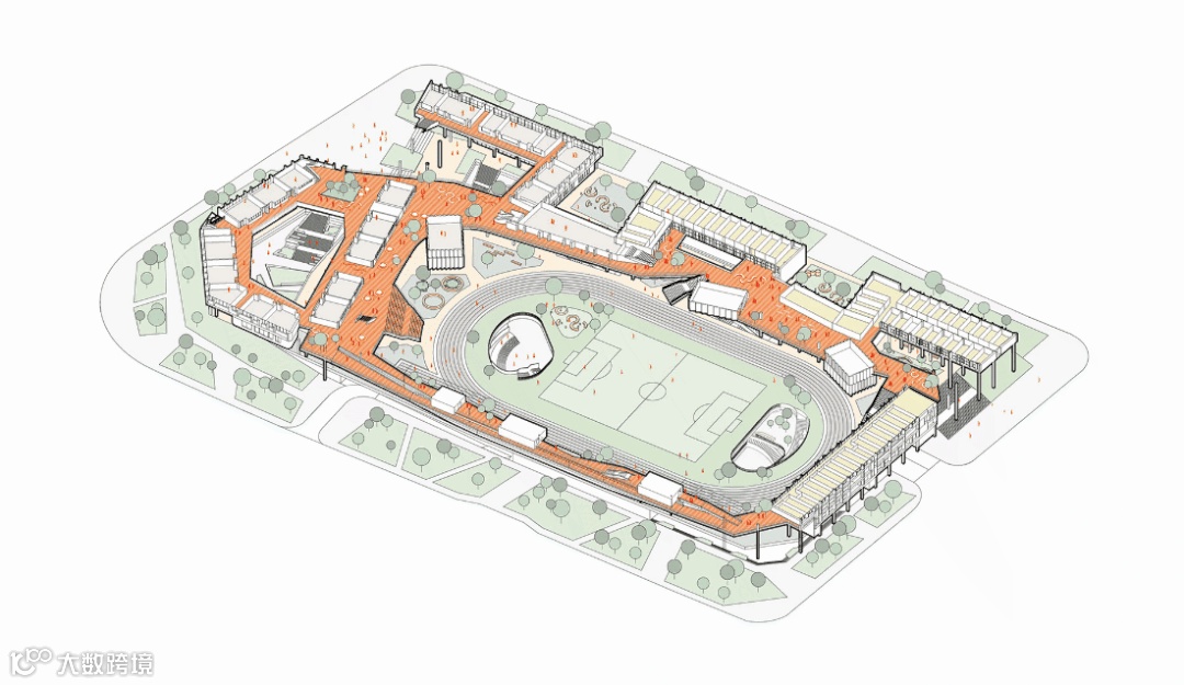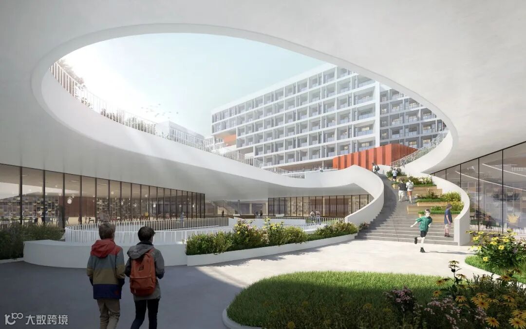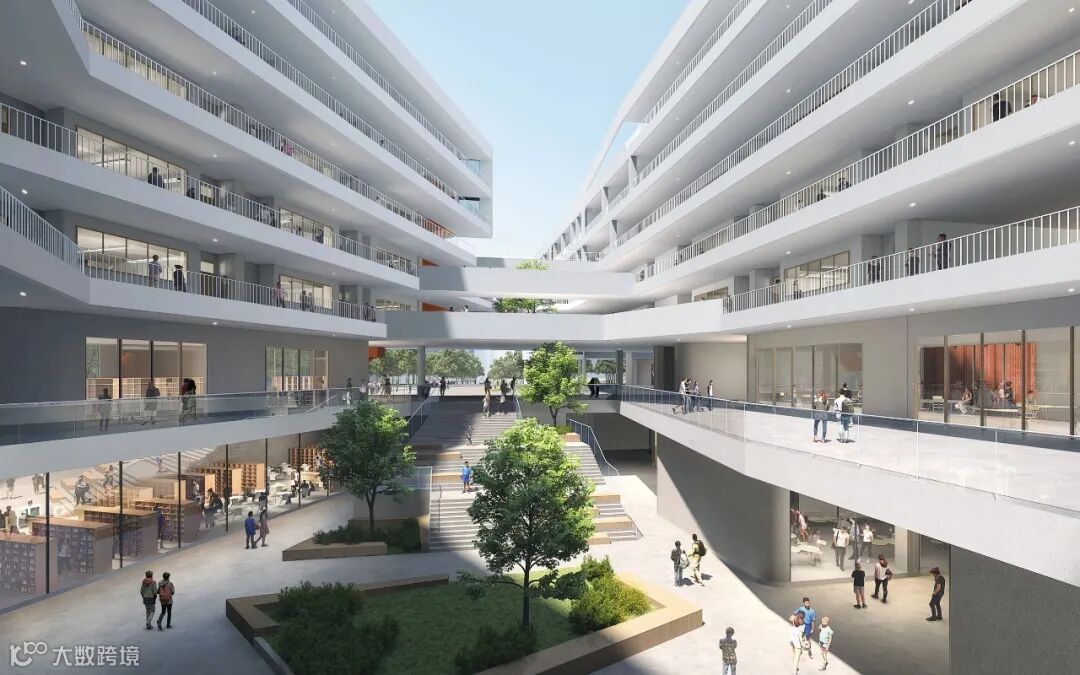 2/ 设置巨型立体环廊串联整个校园,在水平方向上增加了每个学生的平均公共活动空间面积,在垂直方向上使得学生在课间休息时能快速到达地面活动层。