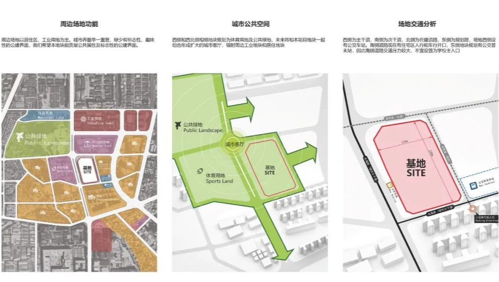 基地周边以居住用地、工业用地为主。城市界面单一重复,缺少有标志性、趣味性的公建形象,本项目将有机会改善这一状况。