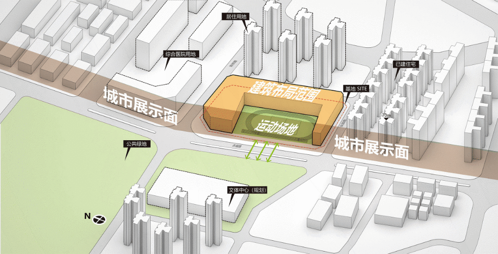 西侧和西北侧相邻地块为体育用地和公共绿地,未来将和本项目地块一起组合形成扩大的城市客厅,辐射周边工业地块和居住地块。西侧为主干道,南侧为次干道,北侧为在建道路,东侧为规划路,场地西侧设有公交车站。南侧道路现在有住宅区人行和车行开口,东侧地块规划有公交首末站,因此南侧道路交通压力较大。