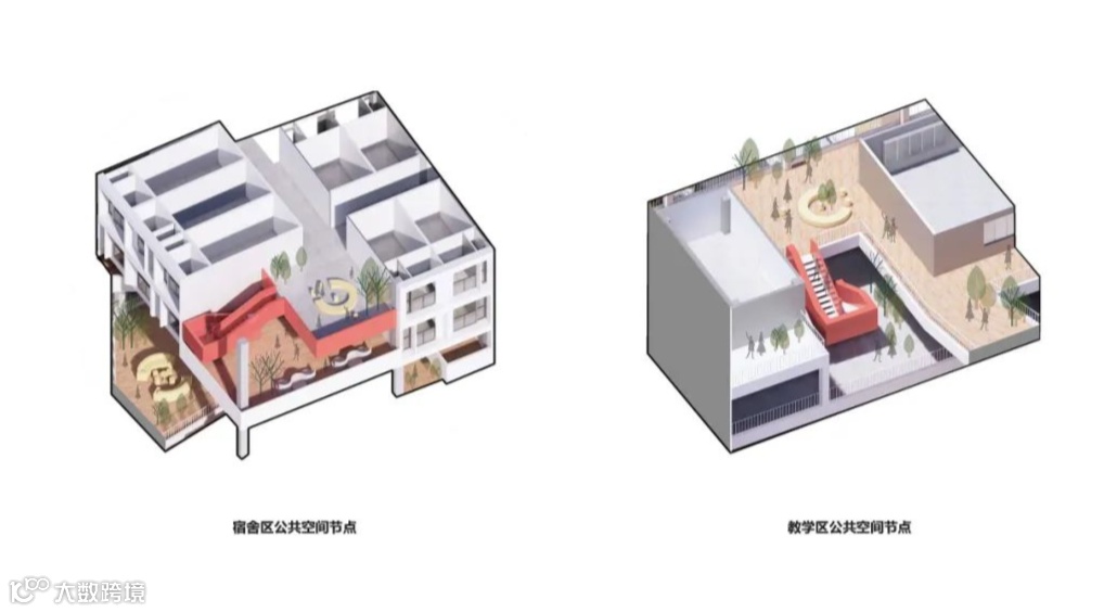 3/ 教学楼和宿舍楼内部每层都设置有开放共享的公共活动、学习空间,拓展学生在课间和住宿期间的活动边界,使整个校园的公共空间系统更加丰富。