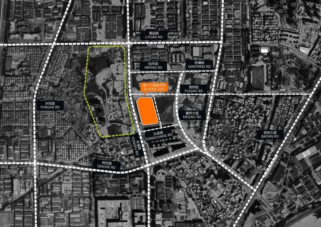 项目基地位于深圳宝安区福海街道永福路与永昌路交汇处东侧,是一所 36 班高级中学。