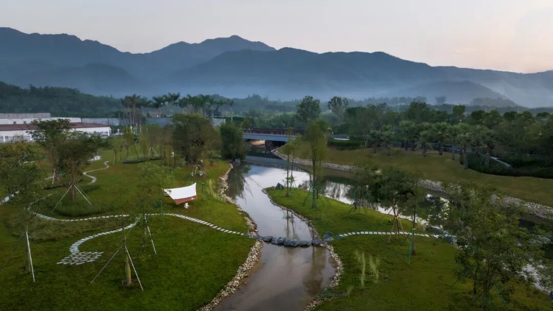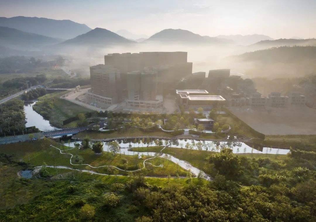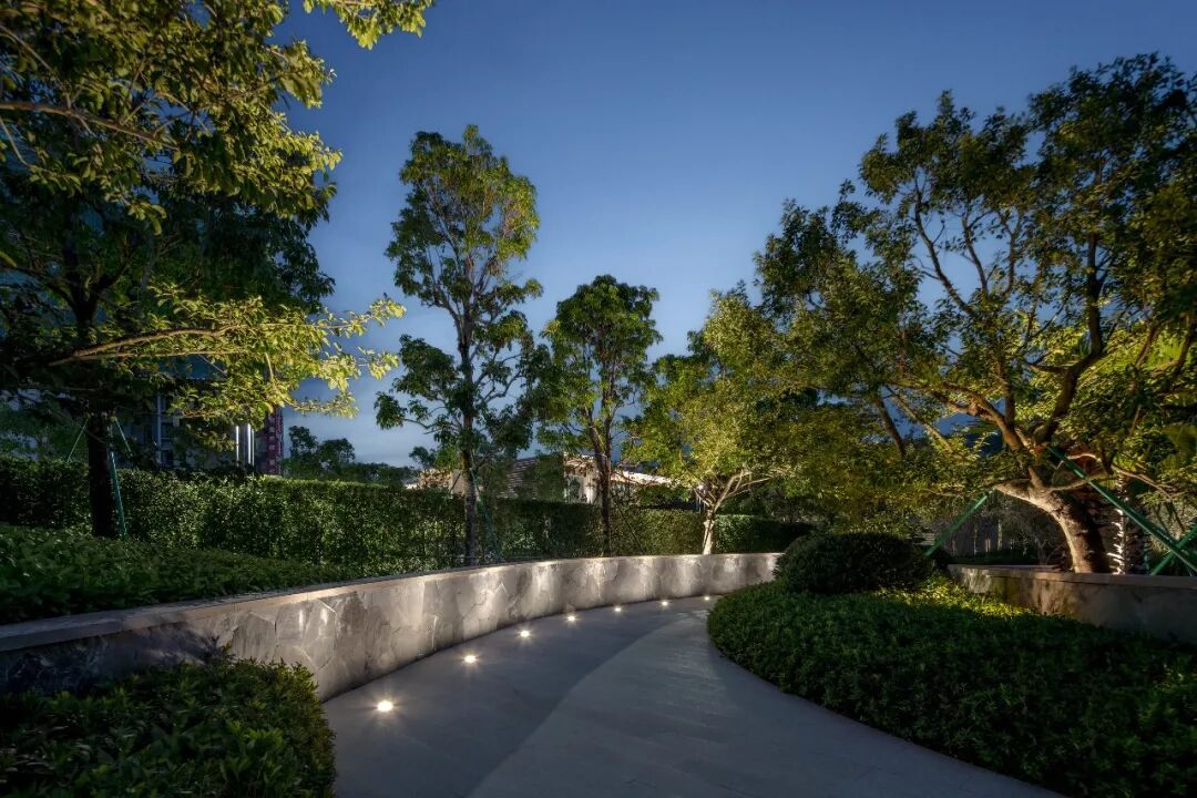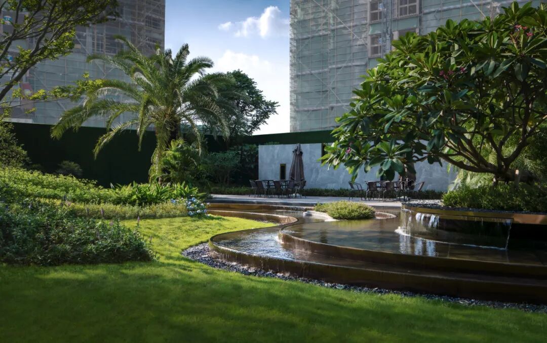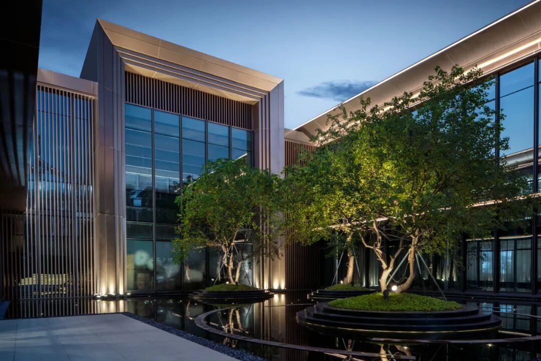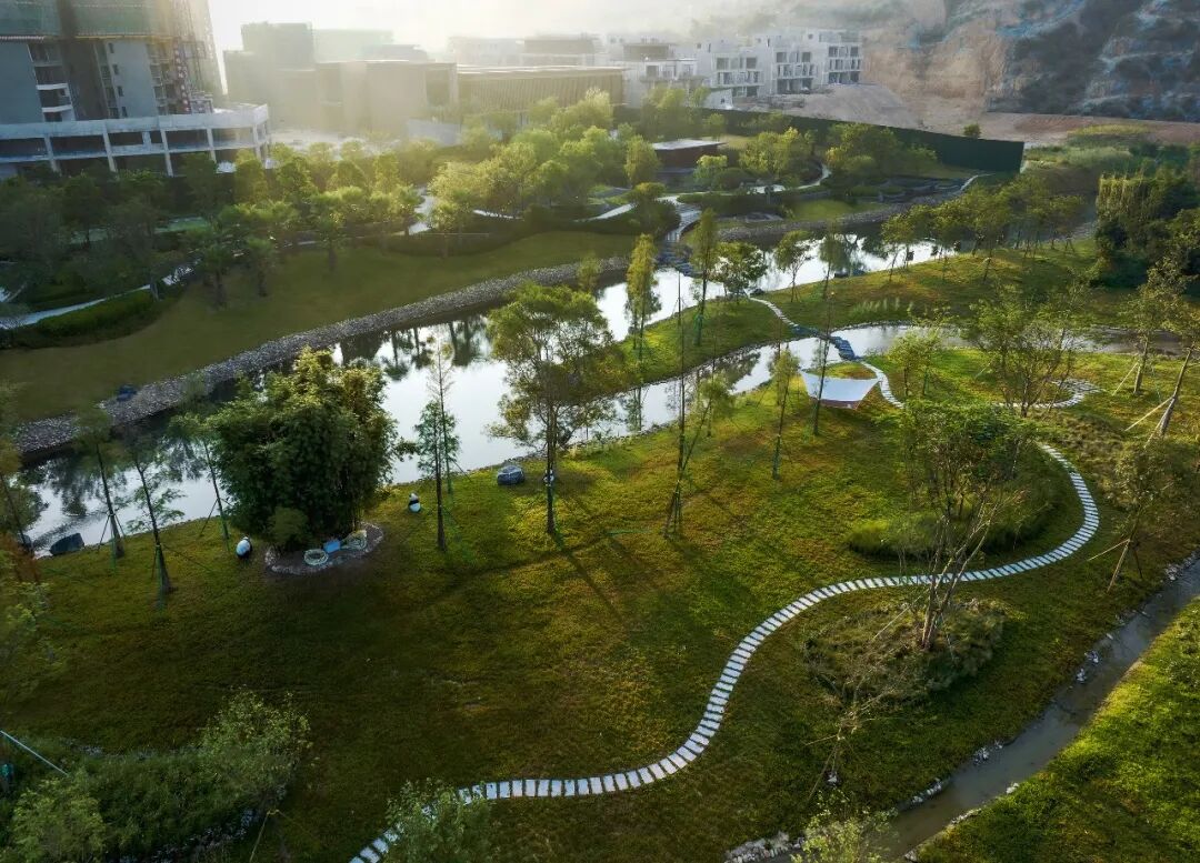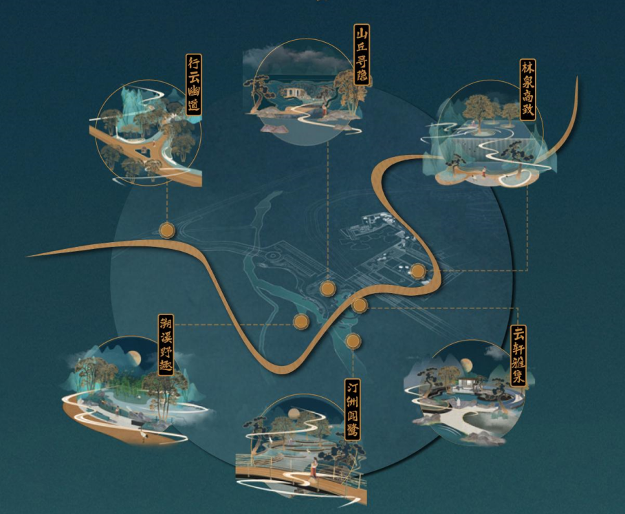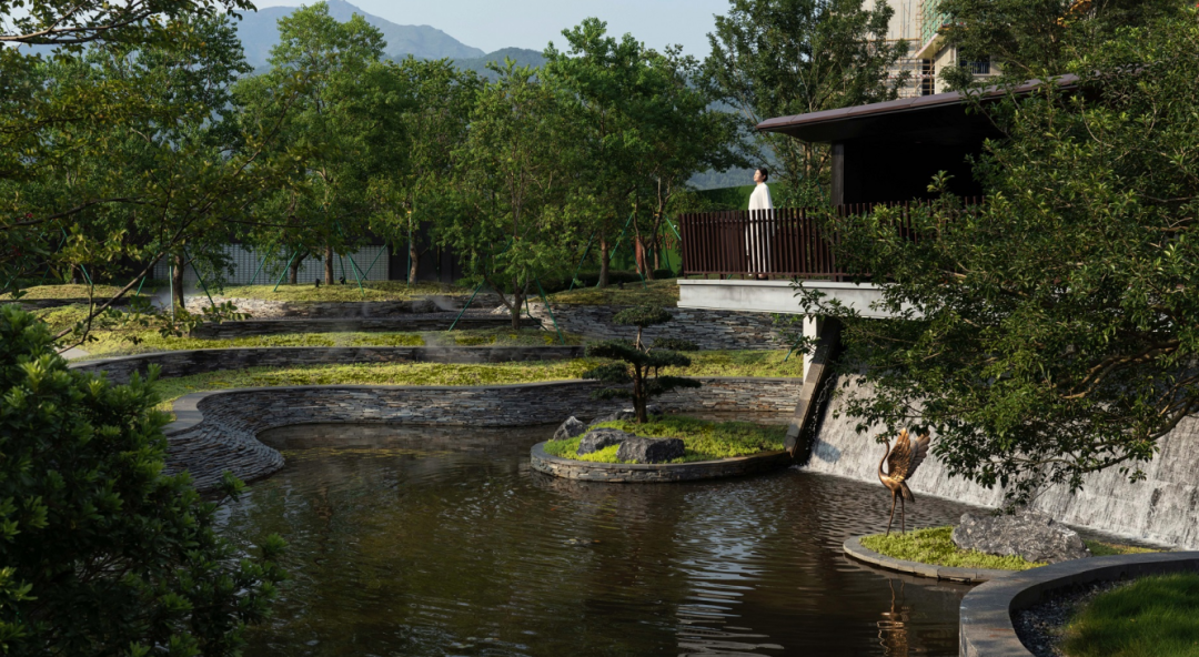 场地内含“山、林、溪”,植被丰茂,水鸟飞翔,我们充分利用周边的景观资源,使设计与自然相融,平衡人居与自然。同时利用溪流打造亲水性空间,自然与空间设计溯源,激发场地领域感回应,营造开合有致的高端体验空间。