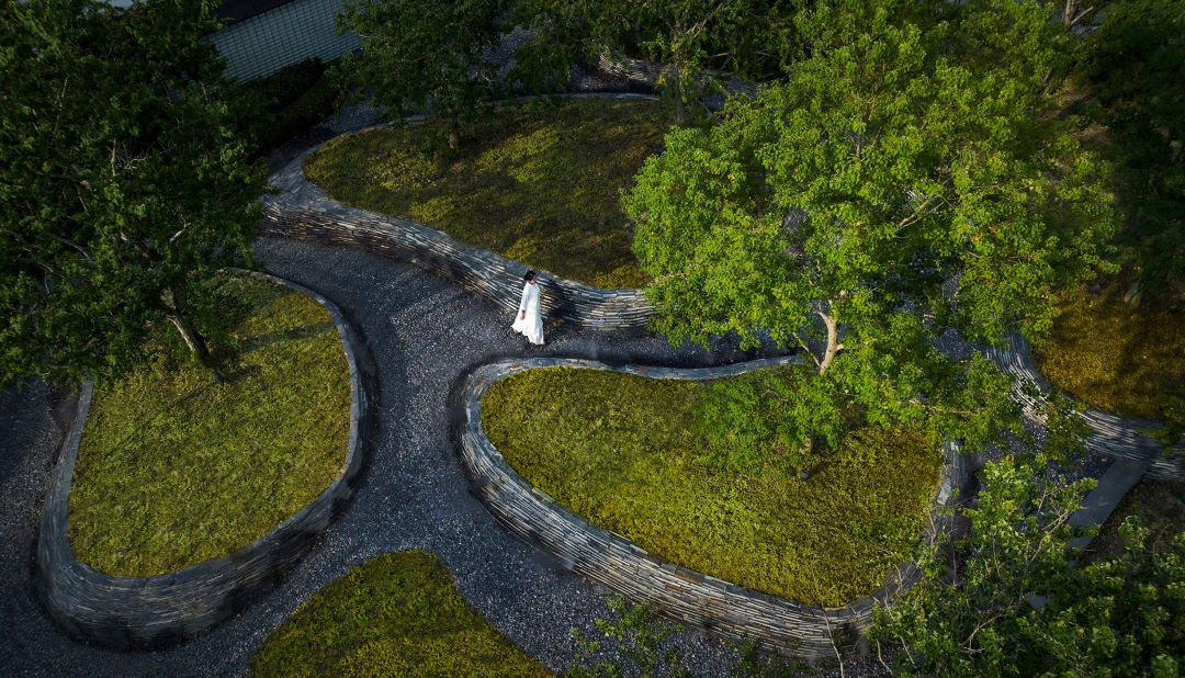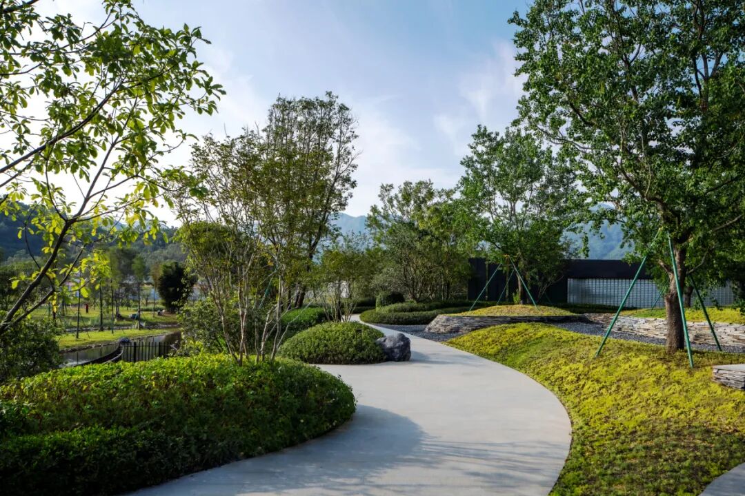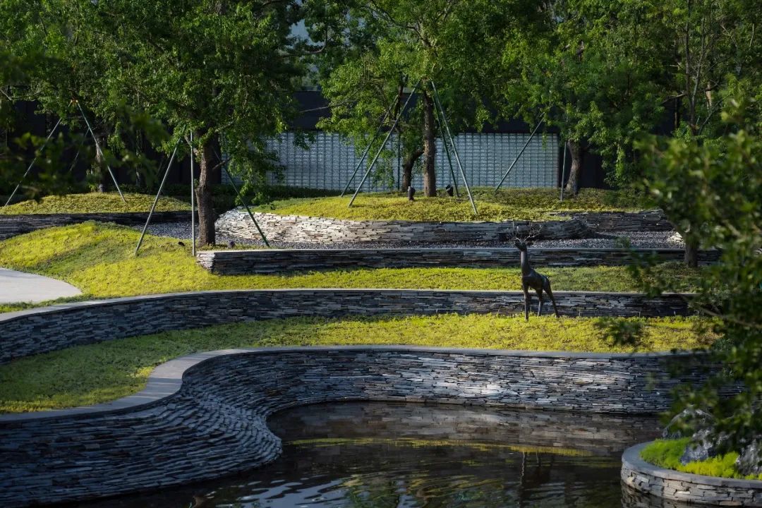 山脉的肌理,林樾的肌理,石墙的质感,无一不在诉说场地故事。片石围墙结合夹道植物,形成整齐简洁的秩序感,惬意漫步,曲径通幽,斑驳树影投映地面,犹如描摹一幅山水画卷。