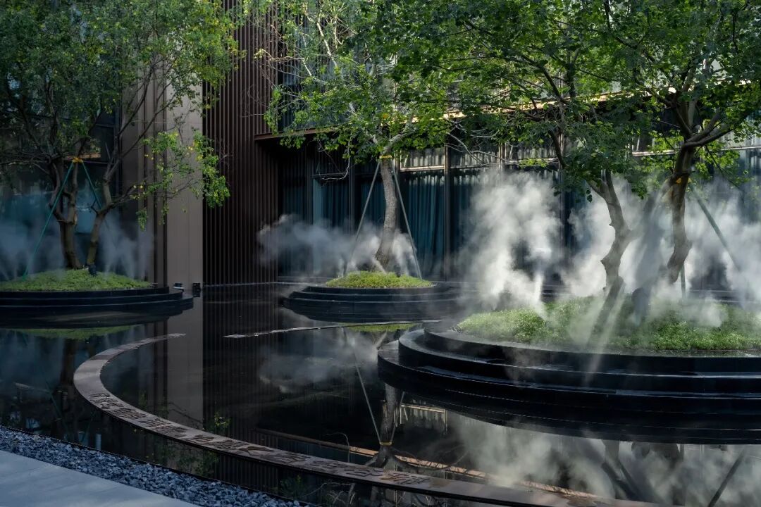 景墙中厚云排叠,水景中平静如镜,呈现开阔宏大的境界,物境、情景、意境共融,营造出了幽远的空间。
