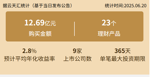 2025年6月20日,上市公司购买理财金额12.69亿元,共9家上市公司,理财产品23个。