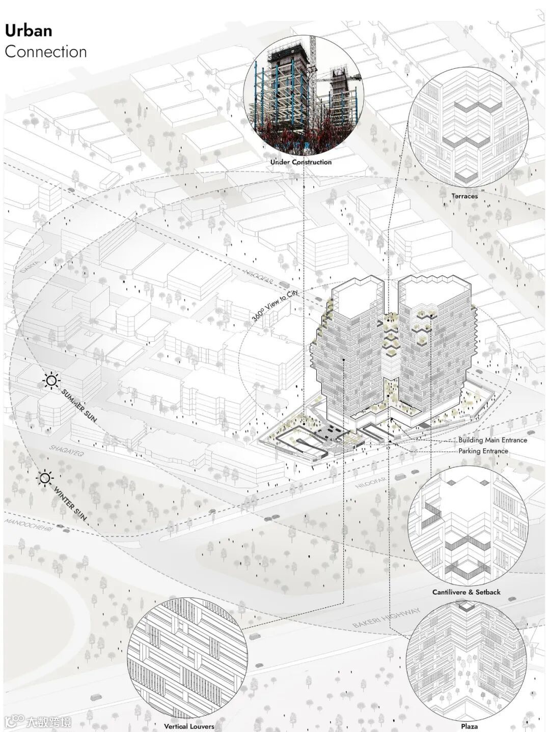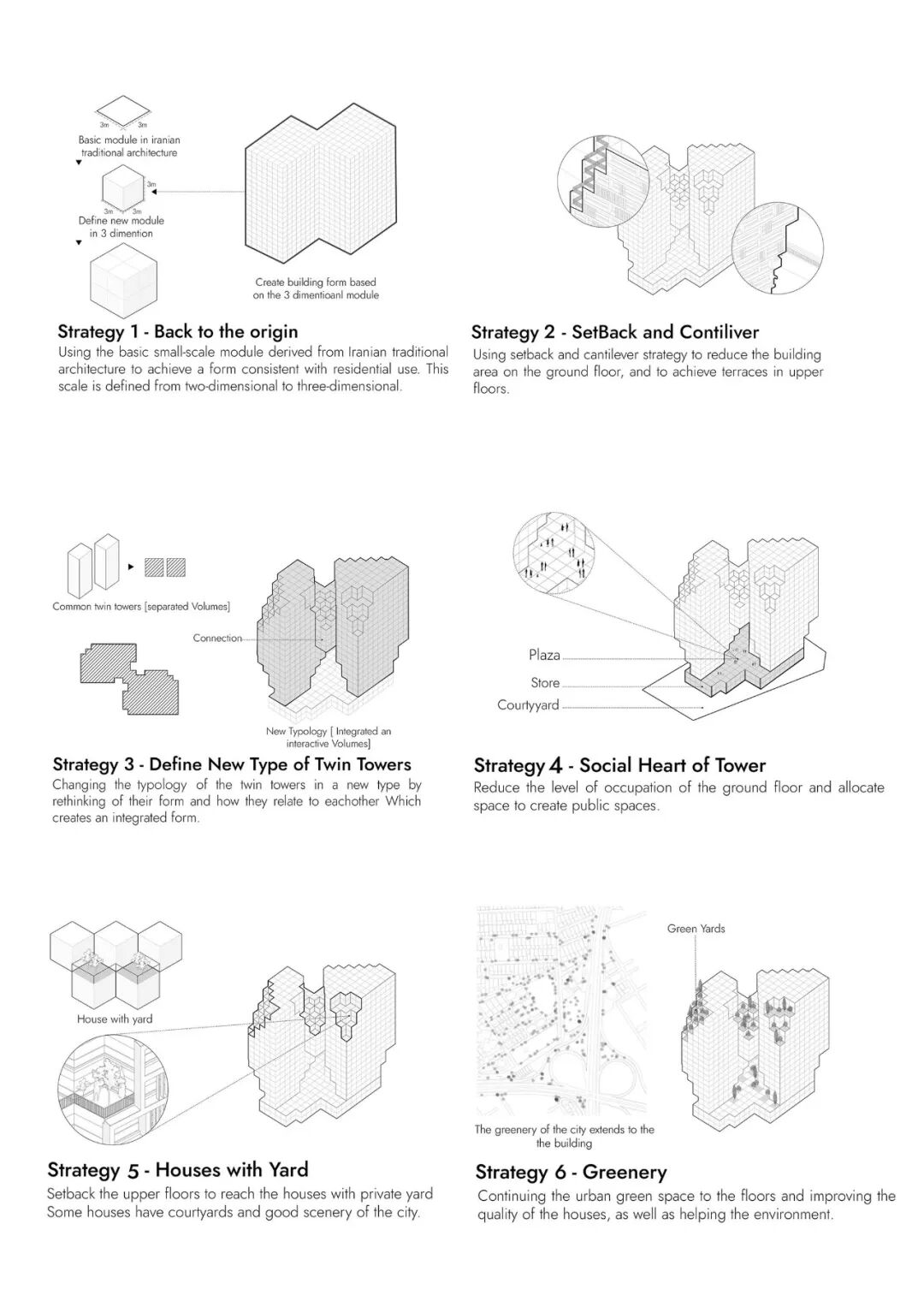 It can be seen that the types of traditional residential architecture in Iran from a long time ago to the middle of the twentieth century, despite some differences in form and details, have been defined in an open-closed space duality. It is obvious that with the modernization of cities and the transformation of residential buildings into high-rise buildings, the quality of life of citizens has greatly changed and declined. By using the basic module, the design team not only has borrowed the concept of “module” and micro-scale modules from traditional Iranian architecture but also by creating a setback on the upper floors, has used the duality of open and closed spaces in a new form to return greenery and light to residential units. The big challenge of this design is the use of units that have always been developed in two dimensions, but this time they fit together in a more complex three-dimensional form. The result of this concept is to improve the quality of life of citizens by taking advantage of the microclimate created by greenery and sunlight.