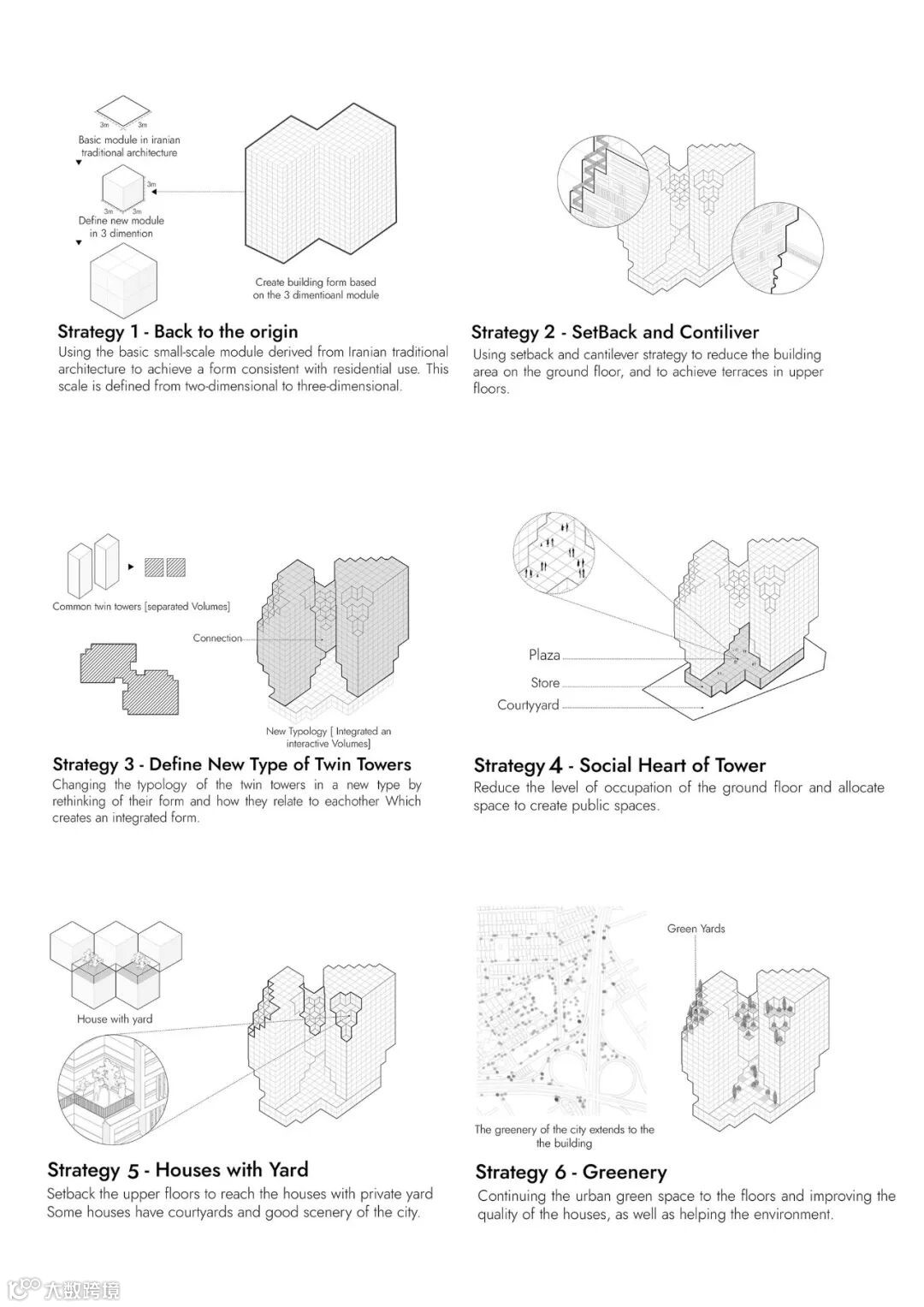 通过使用基本模块,设计团队不仅从伊朗传统建筑中借鉴了 "模块 "和微尺度模块的概念,而且通过在高层创造退台,以新的形式使用了开放和封闭空间的二元性,使绿色和光线回归到住宅单元。这个设计的最大挑战是使用一直以来以二维方式开发的单元,但这次它们以更复杂的三维形式组合在一起。这个概念的结果是通过利用绿色植物和阳光创造的小气候来改善市民的生活质量。