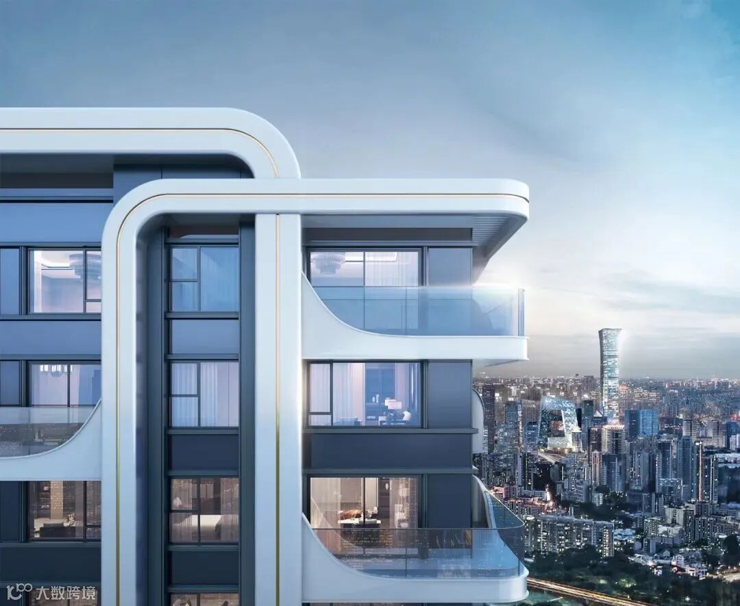 北京世茂天誉在阳台栏杆上设计出一定弧度,通过错层露台设计,让整个立面看起来就像一个一个小太空舱体,呈现出一种独特的未来感。