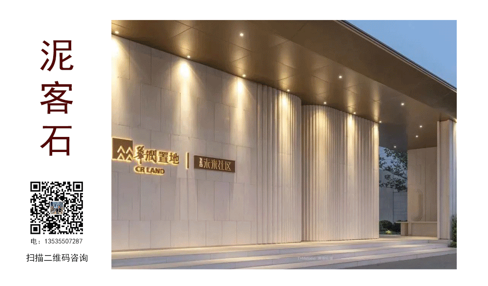 济南融创文旅城·紫檀园单元门头采用干挂石材与金属飞檐结合,檐口下横向金属格栅与铝板搭配都生动的展现出品质和归家仪式感,门头两侧灰空间以精致的金属格栅装饰而不会显得笨重与封闭而更具层次亲切感。