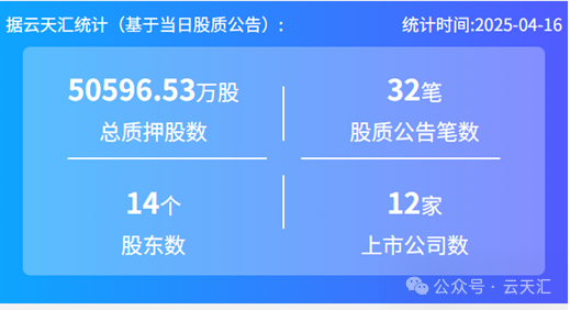 2025年4月16股票质押总质押股数5.06亿股,上市公司数12家,股质公告笔数32笔,股东数14个。