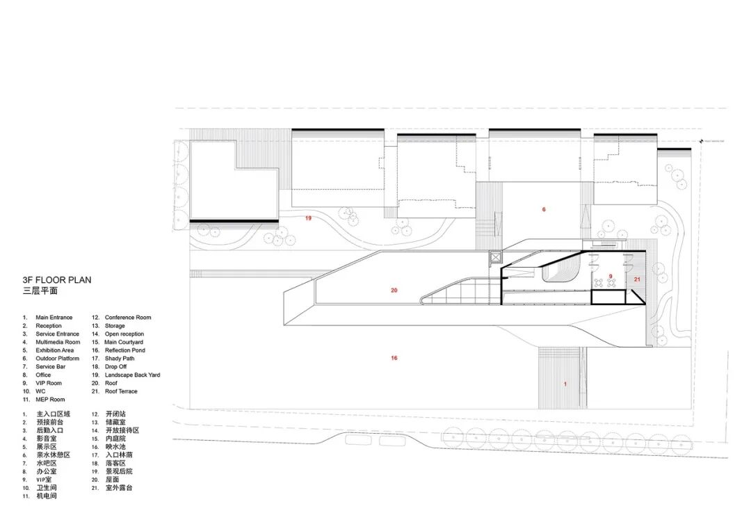 景观庭院位于艺术中心北侧,景物一体的“枯山水”景观将为访客带来有品质的空间享受;游客可以通过位于艺术中心内的中心楼梯来到位于二楼的书房;然后,向东穿过一条洒满阳光的廊桥来到整个建筑最东侧的“船头”部位,眼前徐徐展开的是秦淮河对岸的城市风景。