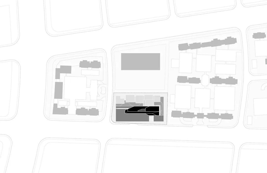 设计通过将建筑从街道向后设置,与高大而密集的城市文脉形成了对比,并最大限度地利用了这一点,在前面创建一个宽敞的倒影池。在创造宁静环境的同时,增加建筑体验的丰富度。在项目背后,郁郁葱葱的植物景观创造了一个从城市生活的喧嚣中喘息的机会.