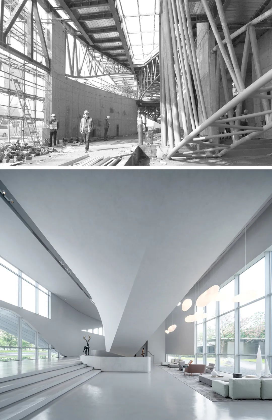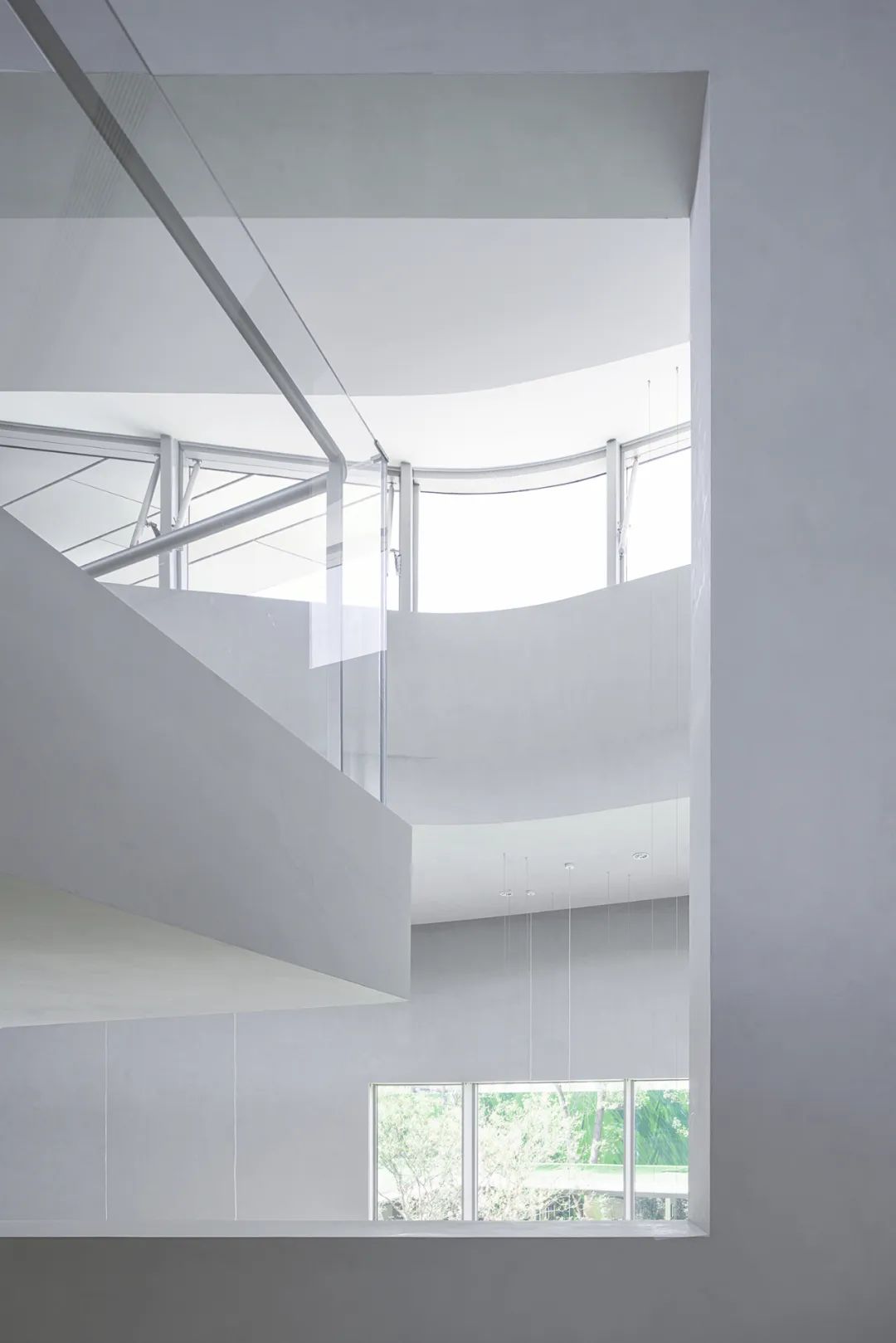 南京艺术中心的多处垂直空间都很好地体现了建筑“翻折、扭转”的概念:第一处即是在两层通高的展览空间区域。多个线性带状平面在此扭转、交织,配以天窗,让阳光自然洒下。