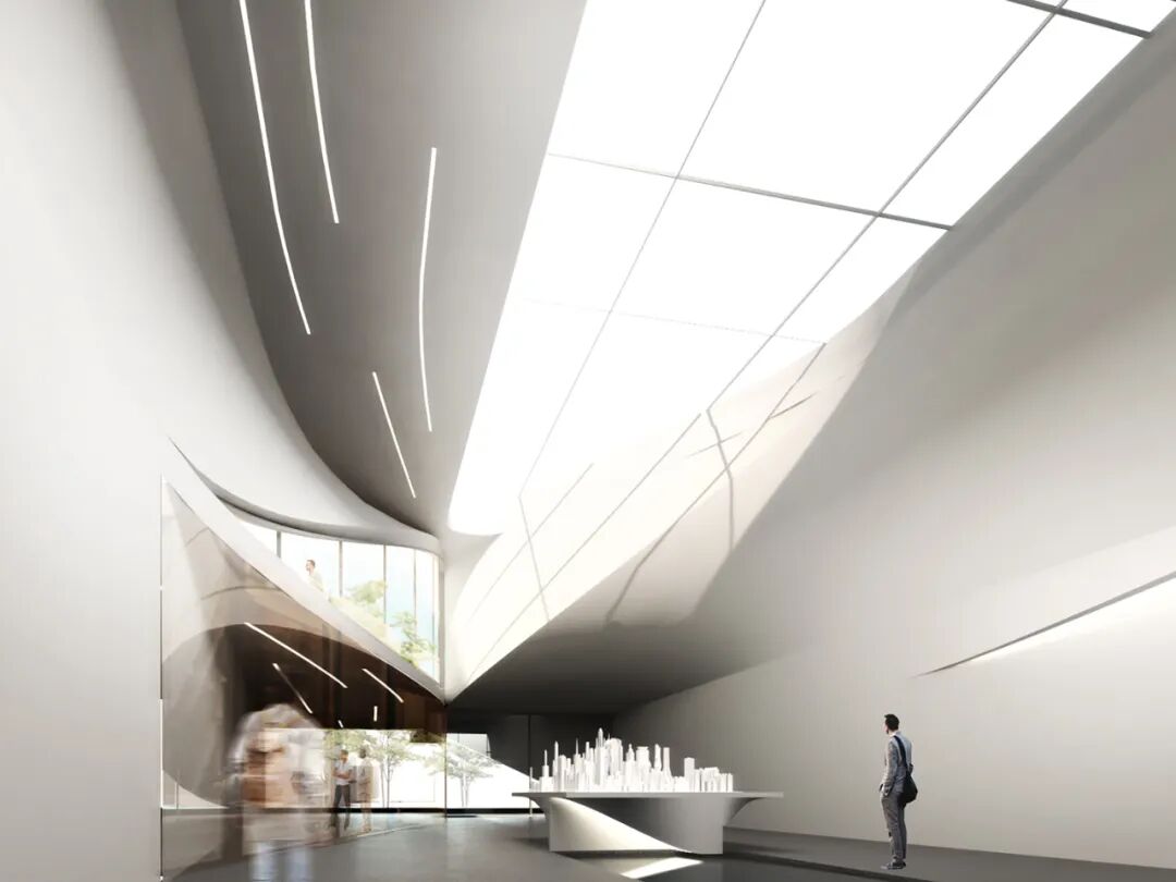 The vertical space of the Nanjing Art Center volume allows for many unique spatial zones rooted in the building concept. This can be seen in three spaces. The first spatial zone finds expression in a double-height gallery space that exists at the intersection of multiple linear “ribbons”. This space is capped with a skylight that floods the space with natural light.