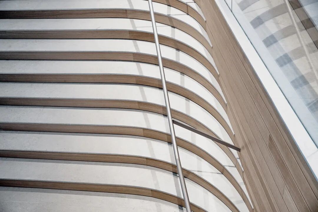 建筑主要的公共楼梯是通过将竖直向的室内墙扭转成横向的平面而得来,这一独特的木质曲面区域将空间竖向与横向之间的扭转体现的淋漓尽致。