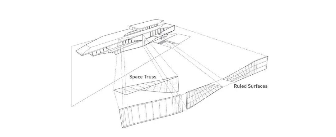 建筑的主体为钢结构+剪力墙体系,把翻转的折墙优化为马鞍形曲面后,建筑师在曲面上提取了一系列的分形直线,并由此生成一系列扇形打开的钢结构空间桁架,它们不仅支撑起了整个建筑的荷载,在建筑主体空间实现了无柱空间,同时也承载了幕墙二次结构的受力;通过结构与幕墙精算,折墙不仅实现了轻薄的壁厚,其双曲面两侧也都承载了重要的空间功能。