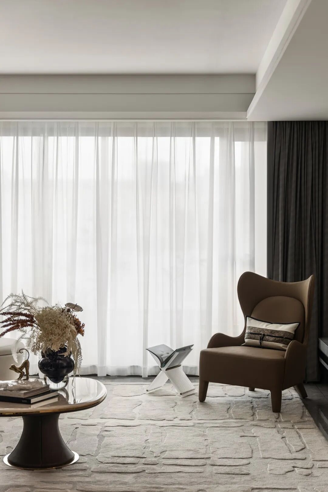 敞亮的空间足以打造主卧的独立小客厅,皮革沙发面向着窗外的自然,阅读休闲或是品鉴音乐,都能带来舒适而低调的体验。