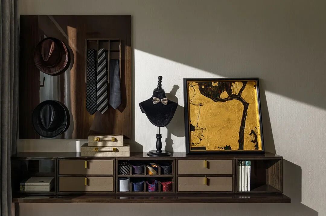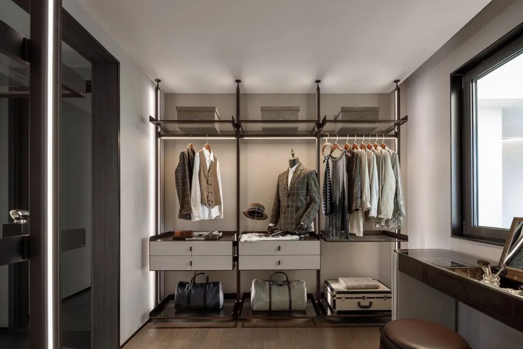 独立的开放式衣帽间可以随着季节流转,更换上合时宜的新衣,饰物在窗前的梳妆台上有序摆放,静待精心挑选。